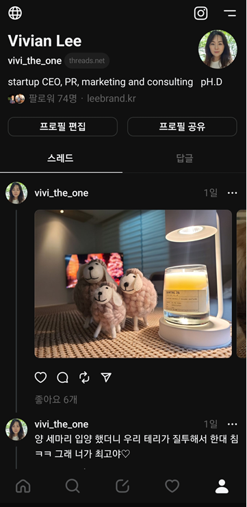 저 역시 스레드를 첫날 가입해서 사용을 하고 있는데요. 아래 이미지를 보시면 포스팅하는 글들이 하나의 줄로 쭉 연결되어 나타납니다.