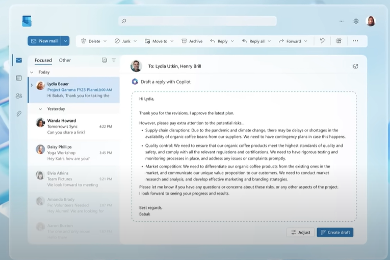 코파일럿이 아웃룩을 열어 이메일 초안을 씁니다.